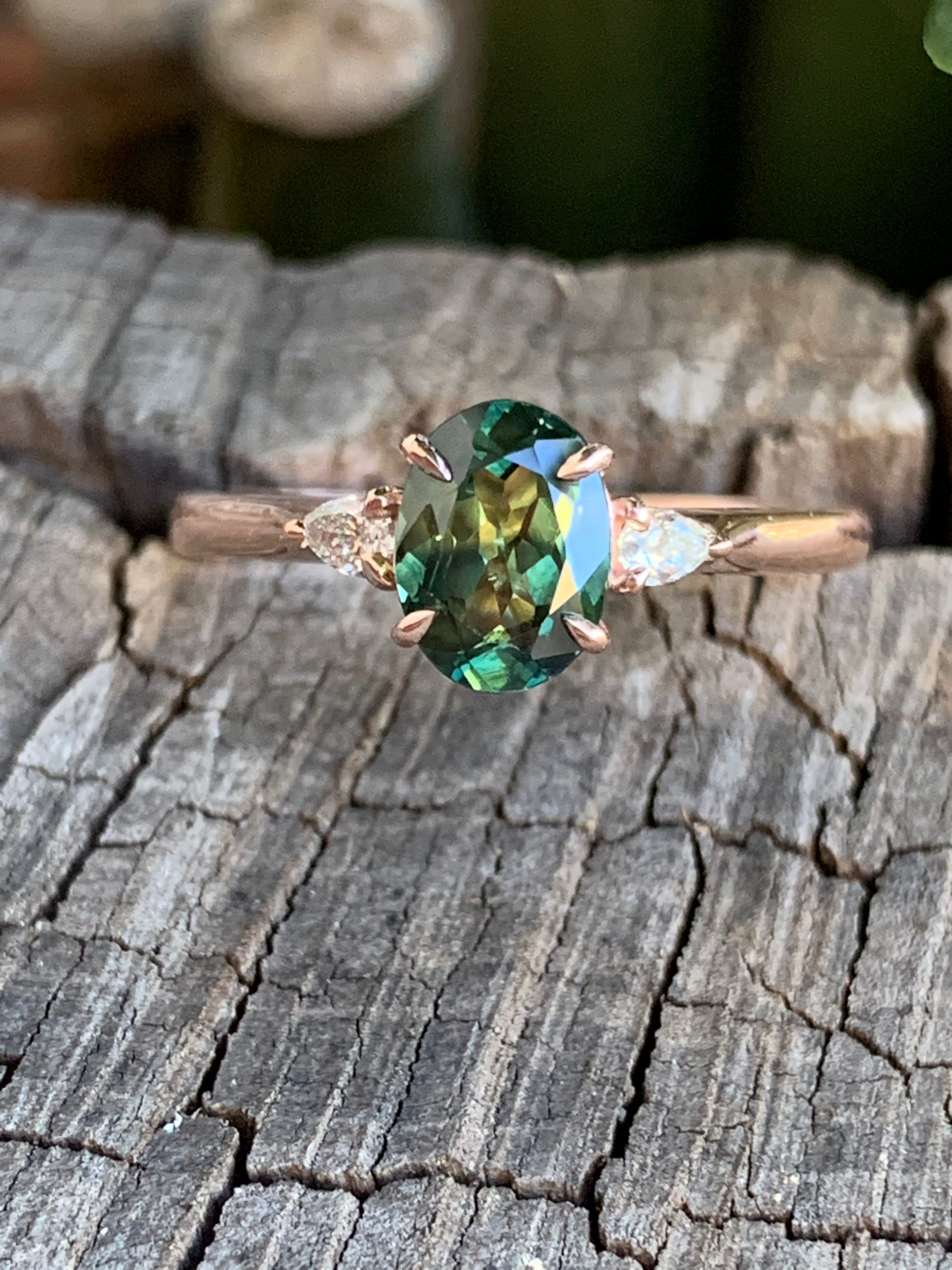 Flaunt your hand selected Ethical Australian Sapphire in The Daisy Setting. Featuring two natural 2x3mm pear shaped diamonds embracing your Sapphire.